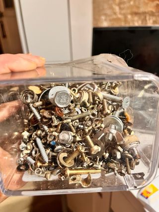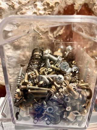 Se vende lote variado de ferretería, ideal para reparaciones y proyectos. - Incluye tornillos de diferentes tamaños y tipos. - Variedad de tuercas y arandelas. - Varios muelles de distintas dimensiones.
