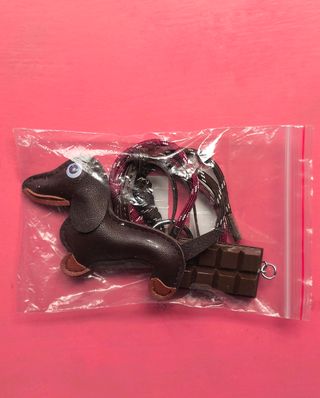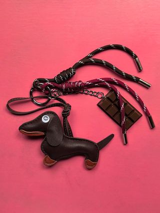 Llavero con un adorable perro salchicha y una tableta de chocolate. - Sin estrenar, conserva su empaque original. - Cuerdas decorativas del llavero incluidas.