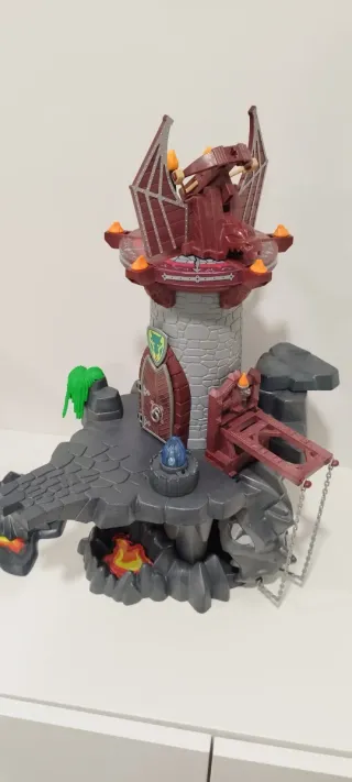 Torre castillo del dragón de Playmobil, un set de juego con temática de fantasía. - Incluye torre con base rocosa y detalles de lava. - Cuenta con un puente levadizo con cadena. - Incorpora un huevo de dragón azul. Llama que se ilumina, necesita pila, pero funciona. - Dispone de una puerta con escudo. Guerreros, guerra, caballeros, medieval, fortaleza, torreon, dragones, despiece, batalla.