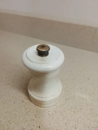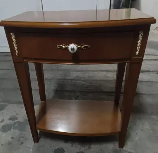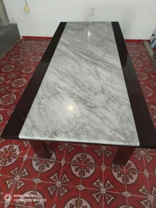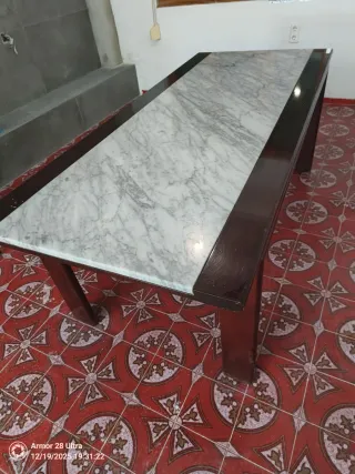 Elegante mesa con una combinación de materiales que le da un toque sofisticado. - Base de madera robusta. - Encimera central de mármol con veteado natural.
