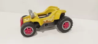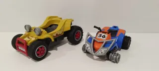 Set lote despiece de dos quads de Playmobil, uno amarillo y otro azul y naranja. - Quad amarillo con detalles de barro y defensa delantera roja. - Quad azul y naranja con número 56 en el frontal. Todoterreno, coche, car, piezas, piloto, carrera, ruedas.