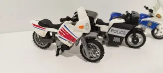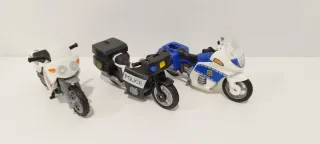 Conjunto set lote de tres motocicletas de juguete de Playmobil. A todas les falta algun accedorio, pero las 3 tienen manillar, ruedas y caballete en buen estado. - Una moto blanca con detalles rojos. - Una moto negra de policía con POLICE escrito. - Una moto blanca y azul de policía con sirena.