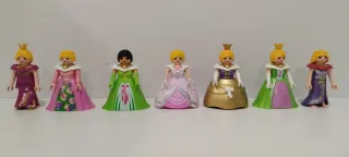 Conjunto lote set de 7 figuras muñecas de princesas reinas de Playmobil. - Figuras con vestidos de gala. - Incluye coronas doradas. - Incluye faldas cancan. Castillo, victoriano, medieval, baile, salon, palacio, corona, realeza, banquete, elegante, gala, despiece.