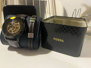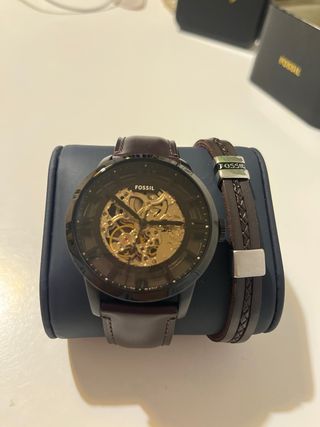 Elegante conjunto de reloj y pulsera para hombre. - Reloj con diseño de maquinaria expuesta. - Correa de piel en tono marrón oscuro. - Pulsera a juego con detalle metálico. En garantía de 2 años comprado en septiembre de 2025.