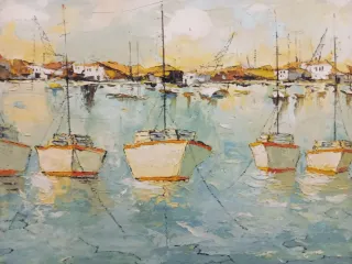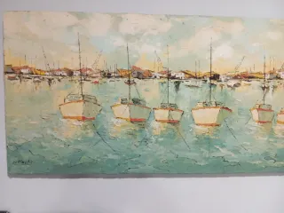 Precioso cuadro vintage que representa un pueblo costero con barcos. - Tonos beige y teal. - Marco de madera.