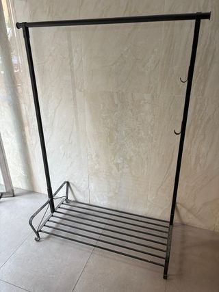 Burro perchero con un diseño elegante y funcional. Ideal para organizar tu ropa o como tendedero. - Estructura resistente. - Base con balda. - Ruedas para fácil movilidad. - Dos ganchos adicionales.