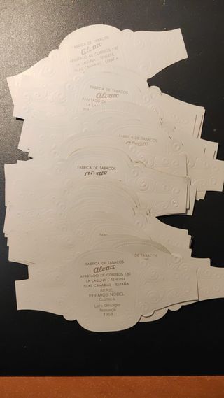 Colección completa de 76 vitolas de la marca Alvaro. - Diseños variados con retratos. - Borde dorado y detalles en rojo y negro. - Cada vitola tiene el nombre Alvaro impreso.