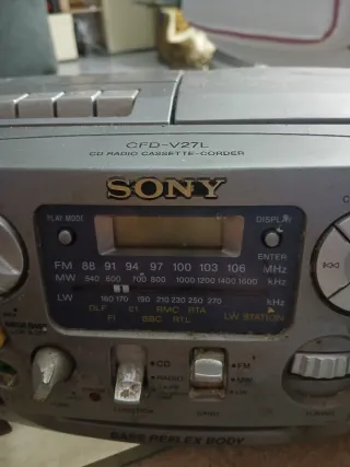 Radio cassette de la marca Sony con un diseño moderno. - Color plateado y negro. - Asa para facilitar su transporte.