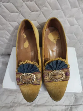 Elegantes zapatos de tacón en color dorado, perfectos para ocasiones especiales. - Material exterior de ante. - Adorno de lazo con detalle metálico. - Ribete decorativo dorado.