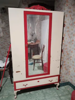 Armario vintage con un diseño encantador, perfecto para una habitación infantil. Perfecto estado, solo necesita una mano de pintura para quedar perfecto - Puerta con espejo. - Frontal un cajón grande - Patas curvas de estilo clásico
