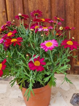Planta de exterior con flores vibrantes en tonos rosas y fucsias. Ideal para dar color a tu jardín o balcón. Es una Dimorphotheca, un género de plantas fanerógamas de la familia Asteraceae es de hoja perenne con flores parecidas a las margaritas, con pétalos que pueden variar en color. - Flores de color rosa intenso y fucsia. - Hojas verdes con forma dentada. adelfa, buganvilla, glicinia, madreselva, malva, agapanto, anturio, ave del paraíso, campanilla, celosía, cineraria, coreopsis, dimorfoteca, gazania, hemerocallis, ixora, kalanchoe, lobelia, nomeolvides, tagete.