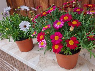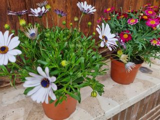 Se venden dos plantas con flores, una de color blanco y otra de color fucsia. El tura 40 cm... son una Margarita argyranthemum y otra Margarita Dimorphotheca rosa, tulipán, margarita, orquídea, lirio, geranio, petunia, begonia, clavel, hortensia, magnolia, hibisco, jazmín, girasol, narciso, lavanda, camelia, azalea, violeta, amapola. - Flores blancas con centro oscuro. - Flores fucsias con centro amarillo. - Macetas de color terracota. Las vendo en pareja a 20€ o cada una suelta a 12€
