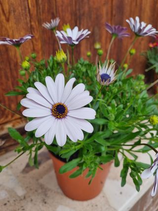 Planta de exterior con flores. Es una Argyranthemum es un género de plantas perteneciente a la familia Asteraceae, es una planta de exterior que resiste bien el frío y el calor. - Flores blancas con centro morado. - Flores moradas con borde blanco. peonía, dalia, anémona, crisantemo, alhelí, boca de dragón, caléndula, pensamiento, fresia, gardenia, prímula, verbena, ciclamen, cosmos, zinnia, ranúnculo, dedalera, impatiens, aliso, capuchina.