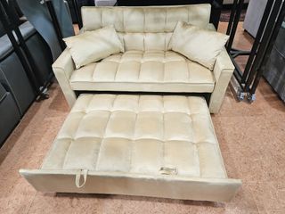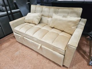 Sofá cama de dos plazas en color beige. Su diseño moderno y acolchado lo hace muy cómodo. - Tapicería de terciopelo. - Dos cojines incluidos. - Mecanismo de apertura sencillo. - 3 años de garantía - Pago contra reembolso - Envío a tu localidad (consulta tarifas)