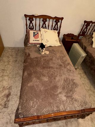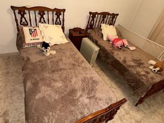 Se venden dos camas individuales de 90cm junto con una mesita de noche. - Estructura de las camas en madera. - Mesita de noche a juego. - Tapicería de las camas en madera