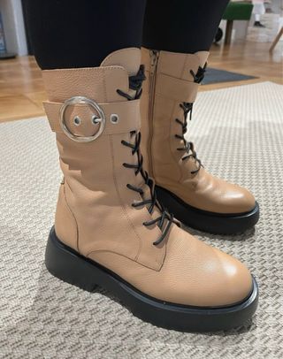 Botas de media caña de piel con un diseño moderno y elegante. - Cierre de cordones y cremallera lateral. - Detalle de hebilla metálica en el tobillo. - Suela gruesa y resistente.