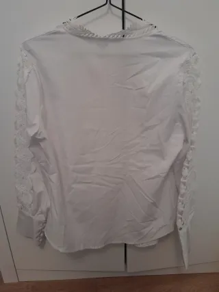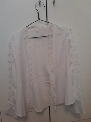 Elegante camisa blanca con detalles de encaje. - Encaje en mangas y borde frontal. - Diseño abierto tipo cárdigan. - Es de Amazon y vino sin etiqueta pero es nueva. Nunca me la he puesto. - Es una L pero talla más pequeña.