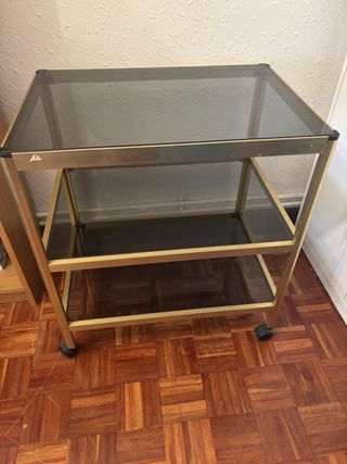 Carrito auxiliar con diseño moderno y elegante, ideal para cualquier espacio. - Estructura de metal en tono dorado. - Bandejas de cristal ahumado. - Ruedas para fácil movilidad.