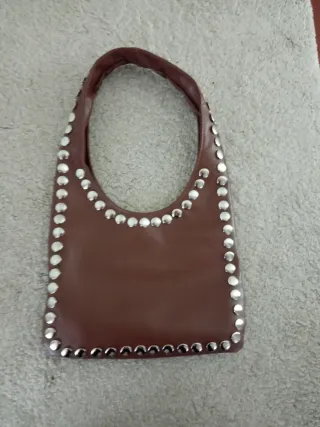 Bolso mediano de cuero sintético en tono marrón, con un diseño moderno y llamativo. - Adornado con tachuelas plateadas. - Asa curva para llevar al hombro.