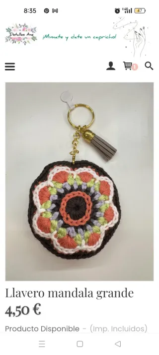 Llavero artesanal con diseño de mandala grande, tejido a crochet. - Colores: marrón, naranja, verde, lila y blanco. - Incluye borla gris y anilla dorada.