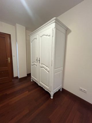 Armario de estilo clásico en muy buen estado. Sus puertas presentan un diseño curvo y elegante, con tiradores ornamentados. - Acabado en blanco. - Fabricado en madera. - Diseño de puertas con molduras. Tiene dos puertas con detalles decorativos y varios compartimentos interiores: barra para colgar, estantes y cajones. Es resistente, amplio y perfecto para dormitorio o vestidor.