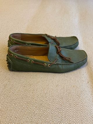 Mocasines de Massimo Dutti en color verde, talla 44. En general están en buen estado salvo un par de rozaduras en la parte posterior. - Diseño clásico de mocasín. - Detalle de lazada en la parte delantera. - Costuras decorativas. - Suela con relieve.