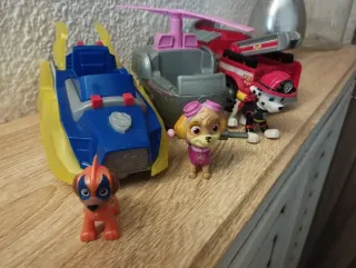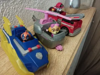Lote de vehículos de Paw Patrol. - Vehículo azul y amarillo , con luces y sonido, con Chase - Helicóptero gris y rosa con Sky - Camión de bomberos rojo con Marshall