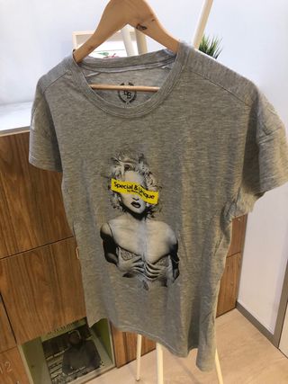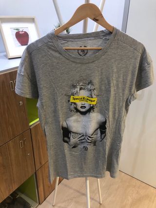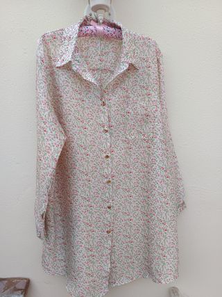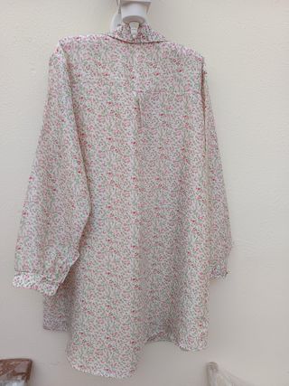 Monísimo vestido camisero de tela tipo organdí blanco con florecitas fresas y verdes. Tiene un brillito satinado monísimo. Los botones son dorados, en los puños y en la pata. Lleva un bolsillo en la parte superior izquierda. También lleva 2 trabillas en los lados pero nunca ha tenido cinturón. Mide 45 cm de hombros, 59 cm de sisas y 91 cm de largo. El bajo es redondeado. No lleva talla pero creo que será una 50. Todavía lleva colgando el precinto de la etiqueta.
