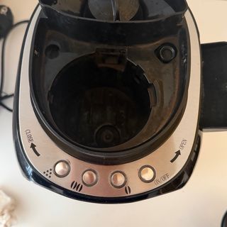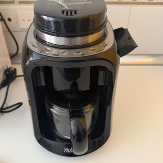 Cafetera eléctrica negra con función de molinillo integrado. Permite preparar café recién molido. - Diseño moderno y compacto. - Jarra de cristal. - Panel de control con botones.