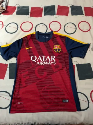 Camiseta de entrenamiento del FC Barcelona de la temporada 2015-2016. Presenta un diseño llamativo con detalles en azul marino y amarillo. - Talla M , tiene muy poco uso , está perfecta , salvo donde pone la talla que se quitó un poquito , por lo demás como nueva - Logo de Nike. - Escudo del FC Barcelona. - Patrocinio de Qatar Airways - Tecnología Dri-FIT.