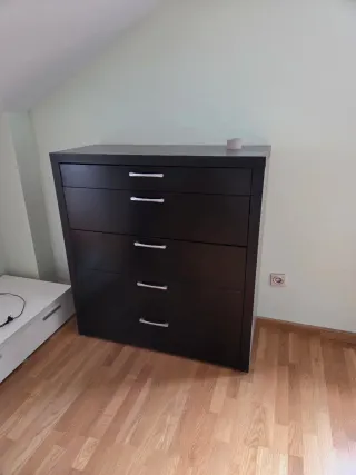 Conjunto de cama de matrimonio, cabecero, cajonera y dos mesitas de noche. Medidas cama 200x210x20. Para colchon de 150x200 Medidas mesillas 40x63x32 Medidas cajonera 47x115x123 - Estructura de cama de color negro. - Mesitas de noche con cajón. - Acabado en madera.