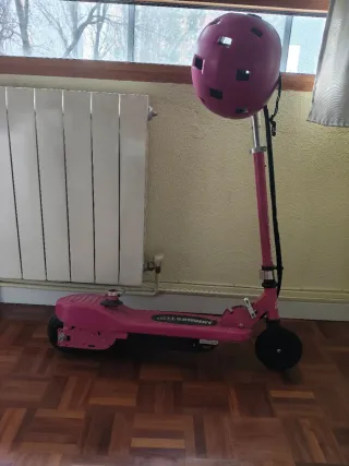 Patinete eléctrico de color rosa, diseñado para niños. Incluye casco protector a juego. Edad aprox de 6 a 10 años - Color rosa vibrante. - Casco protector incluido.