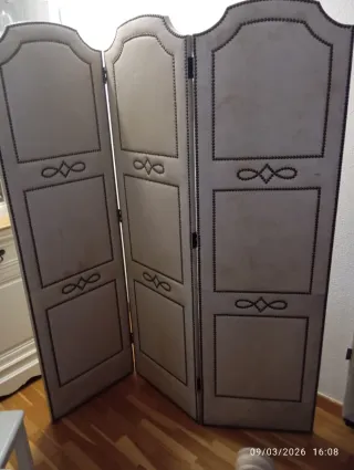 Biombo decorativo beige con tachuelas incrustadas