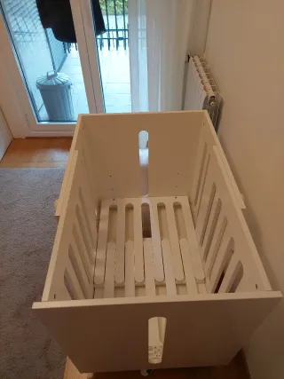Cuna de la marca MOODELLI en color blanco. Diseño moderno y funcional. - Estructura de madera lacada en blanco. - Laterales con barrotes. - Ruedas para facilitar el desplazamiento. - Longitud max 115 cm - Longitud min 65cm