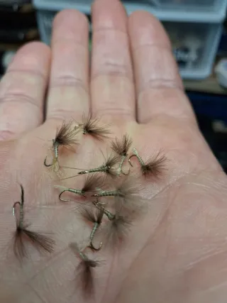 8 emergentes en anzuelo fulling Mills 5055. 4 en el 18# y 4 en el 20#. Color parecido al g.431. Muy pescador.